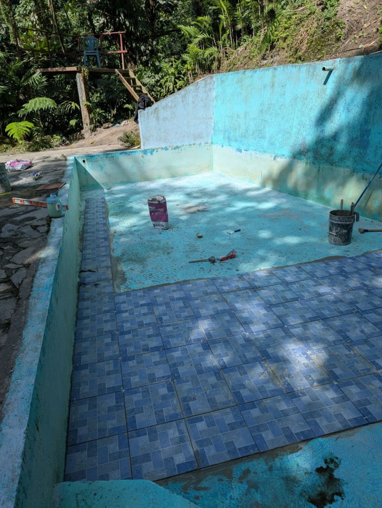 Le projet auquel nous nous sommes engagés consiste à soutenir la rénovation des piscines du centre touristique local. Notre tâche est de transporter du sable, à quinze minutes de marche dans la montagne, jusqu’aux piscines. Chacun contribue à son rythme et selon sa force!