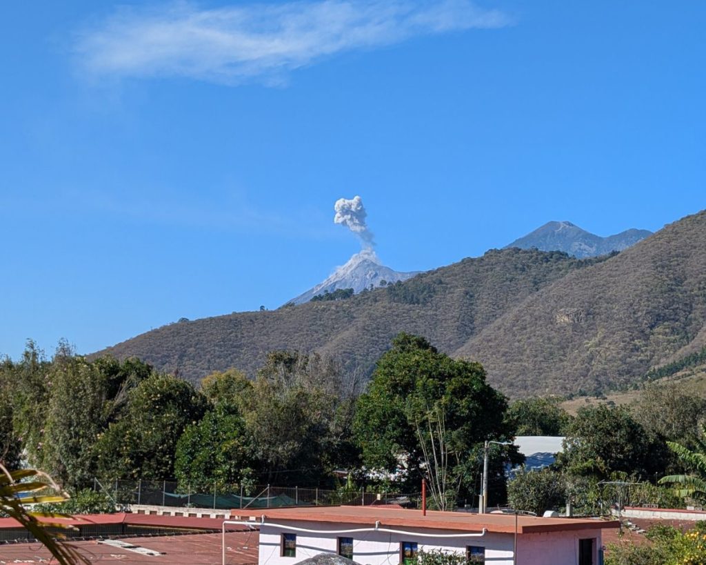 Nous sommes hébergés à l’hôtel, en chambres partagées. Depuis la terrasse sur le toit, nous admirons le volcan Fuego, fumant régulièrement et crachant du feu, l’émotion est au rendez-vous!